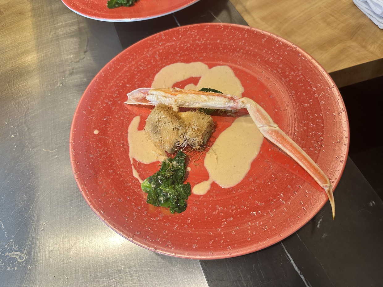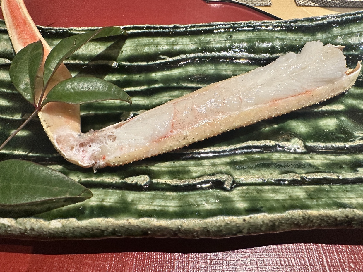 松葉がには、鉄板でふっくらとソテーして。付け合わせのカダイフに巻かれているのは、地元で愛される名物「とうふちくわ」。すり身に豆腐を加えたご当地の味が、粋な仕立てで華を添えています。