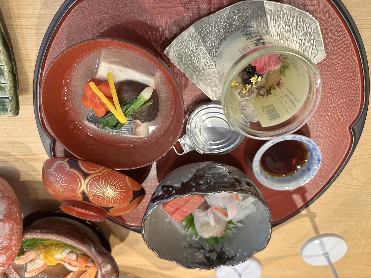 今回の懐石コースは、他にも鳥取県産の豊富な食材がふんだんに味わえます。先付はねっとり甘い甘海老の醤油漬けをキャビアと合わせて。お椀は霙仕立てで、身厚な鰆と原木椎茸「とっとり115」など食べ応えのある椀種を合わせて。脂が乗ったお造り三種も舌を喜ばせてくれること請け合いです。