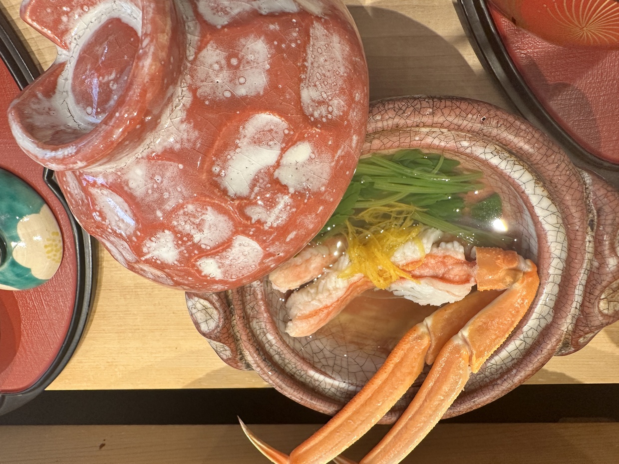 一方小鍋で供される松葉がには、ふわっとしたカニ身が出汁を含み、何とも幸せなひと口に。焼きとはまた趣の異なるカニの上品でふくよかな旨みが引き立っています。シャクっとした芹の緑と柚子の黄色。見た目も美しく鮮やかなひと品です。