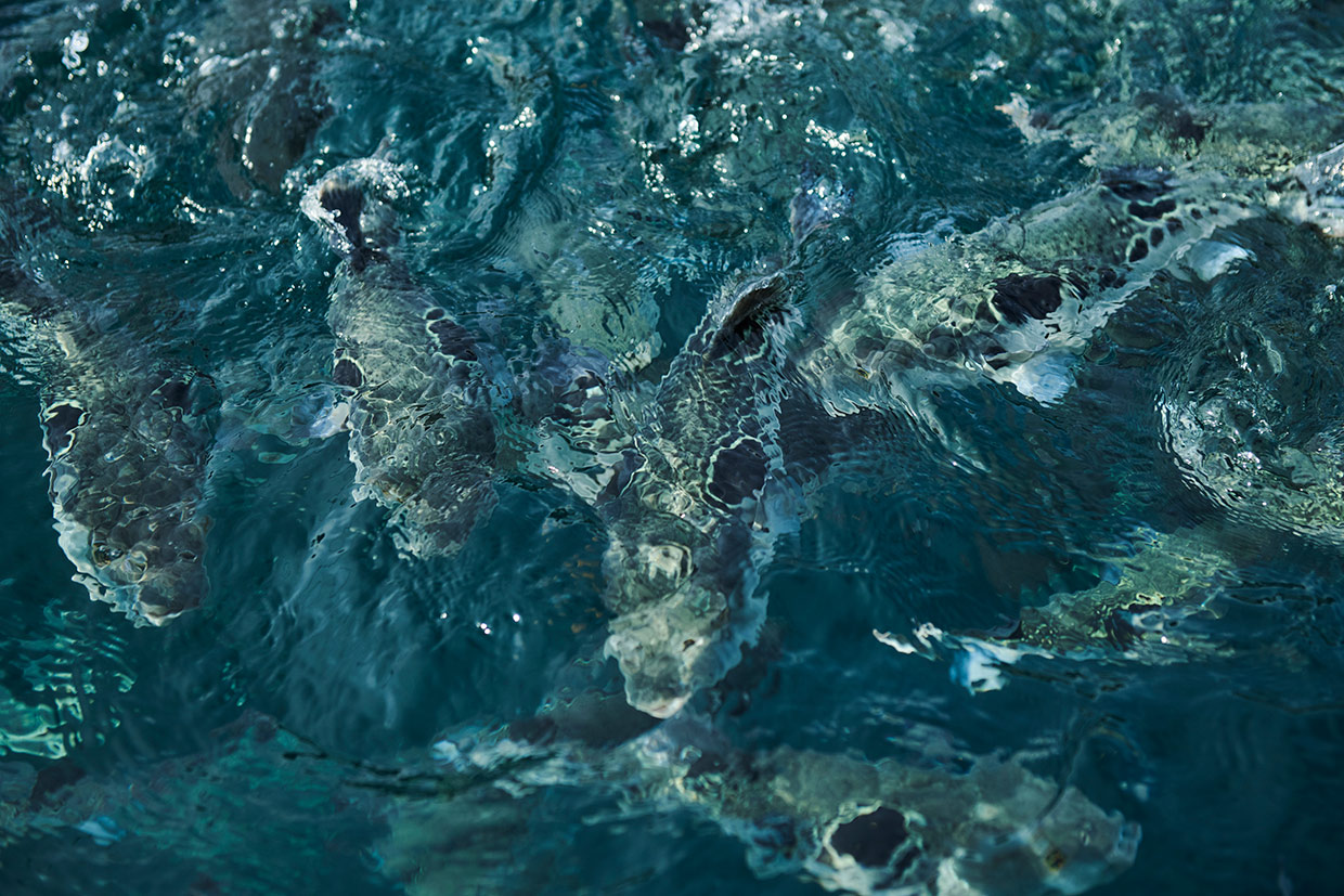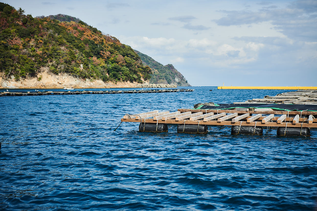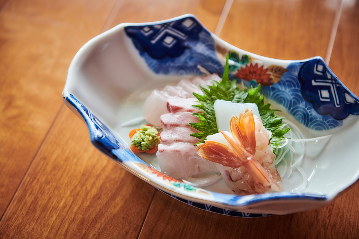 次の目的地は高浜町。海沿いに続く山道を進むこと約1時間。透明度の高い内浦湾に面して建つ『料理旅館 由幸(よしこう)』が見えてきた。出迎えてくれた主人の山本博史さんが操る渡船に乗りこみ、湾内の生け簀へ。山本さんが飼料を撒くと、日本最北端級の養殖海域で育つ“若狭ふぐ”が次々と水面に顔を覗かせる。「稚魚から2年かけて育てています。低脂肪の飼料を与えるため、身が締まっています」。少し離れた生け簀を悠々と泳ぎ回るのは、高級魚のマハタ。ブランド名は“若狭まはた”で、1年半かけて育てている。