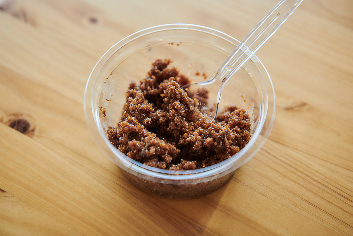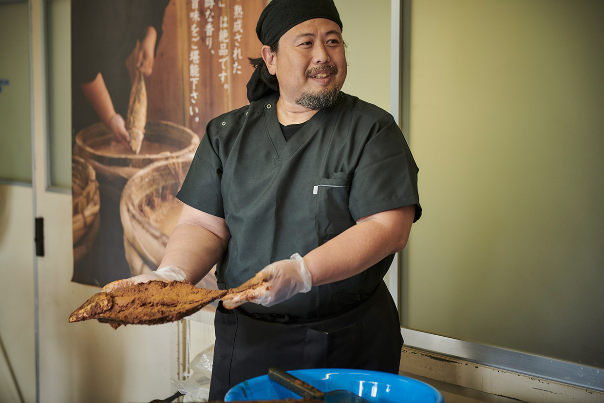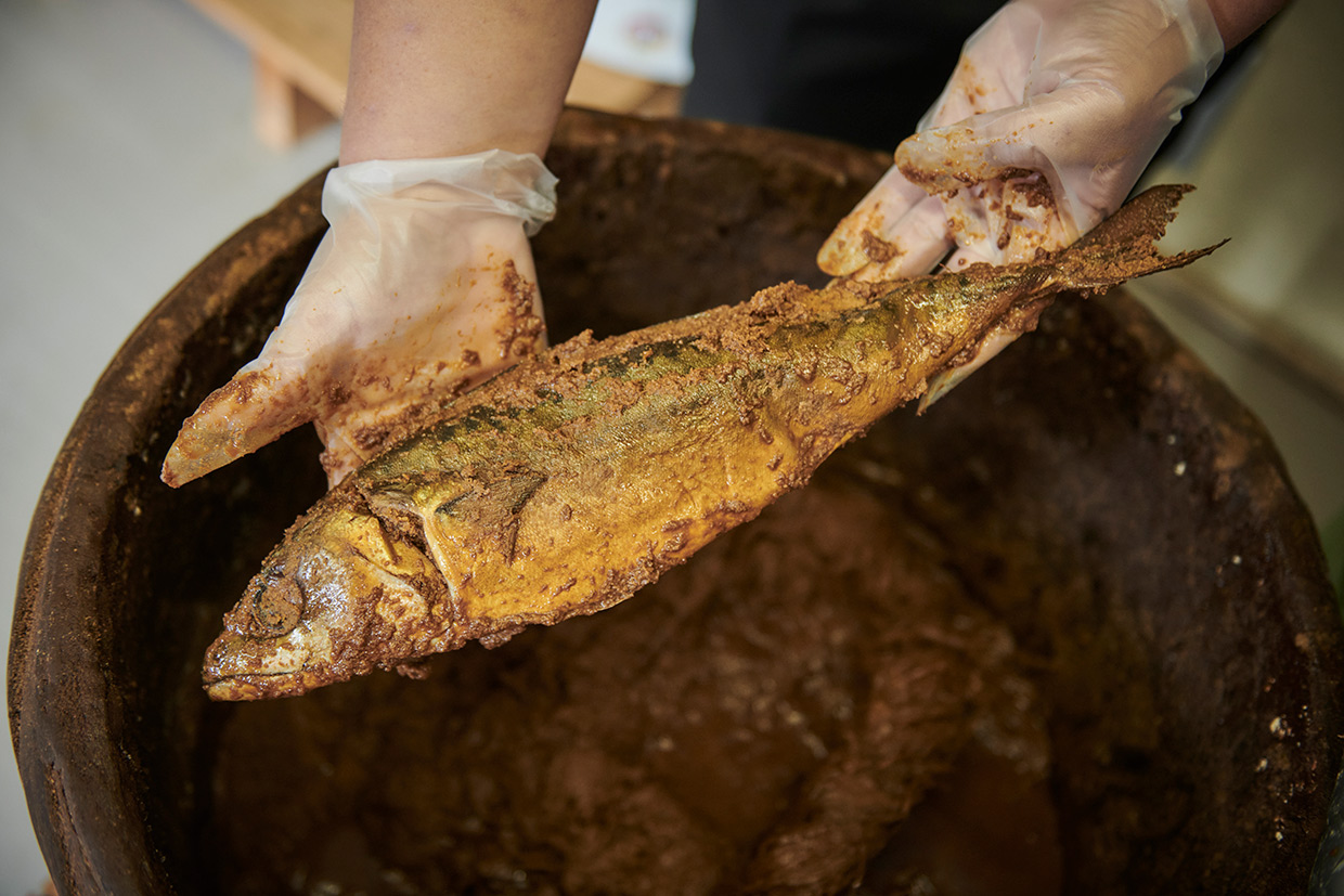 その後、糠を加える本漬けを行い、1年以上かけて自然発酵させる。糠を落としてスライスした濃い飴色のへしこは、旨みの塊と化した珍味。「日本酒を呼ぶね~」の声が上がる。「糠を付けたまま弱火で炙るのも美味しいですよ」。そう話す角野さんが次に薦めてくれたのは、へしこに無農薬栽培の米と麹を加えて漬け込むなれずし。「ウチの集落では、なれずしを甘めに作ります」。クセのない味わいに箸が進む。