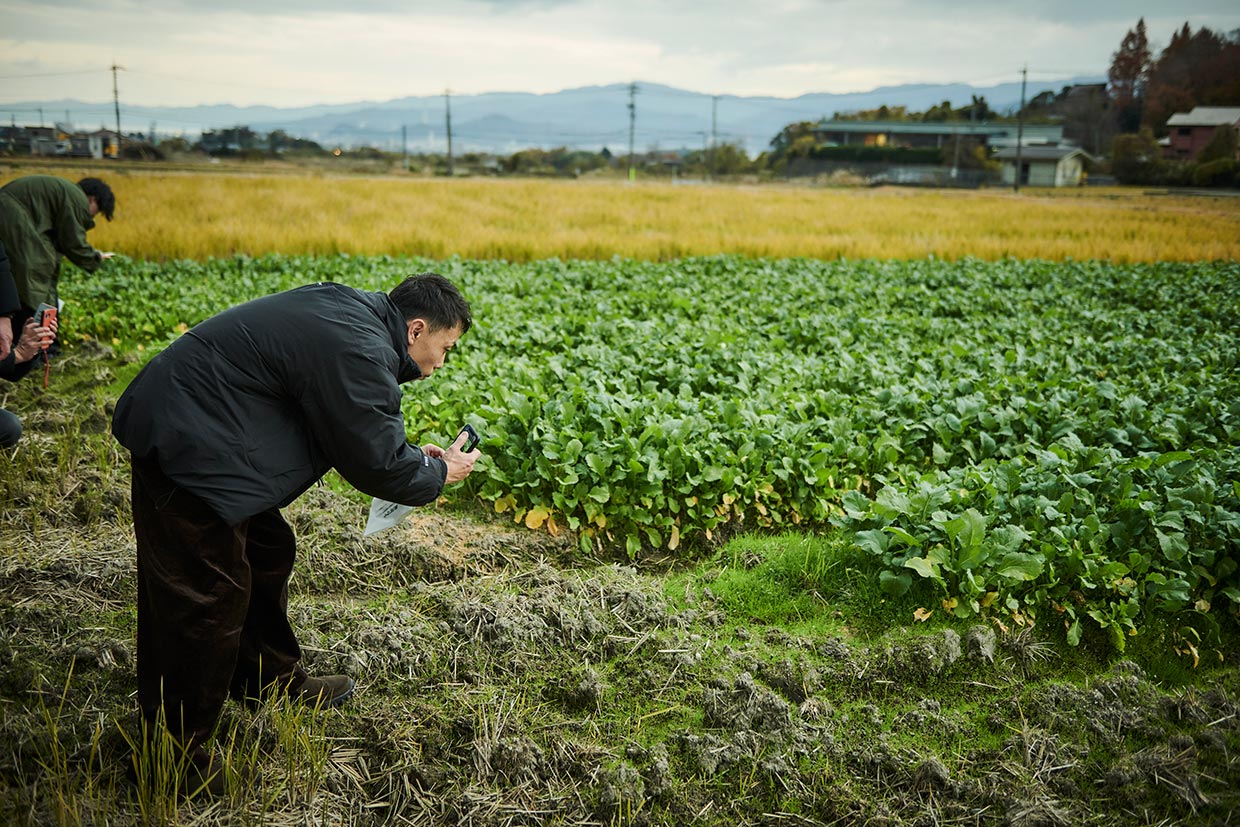続いて、敦賀市の南部を流れる黒河川の最上流に位置する山集落で親しまれている伝統野菜・黒河(くろこ)マナの畑を訪問。山農家組合長の林 省一さんは「あっさりした風味で、雪の下で冬を越すことで甘くなります。塩漬けはご飯の供に。お浸しも旨いですよ」と目を細めた。