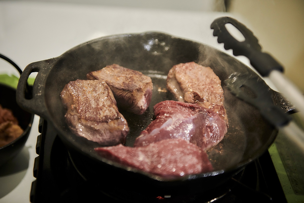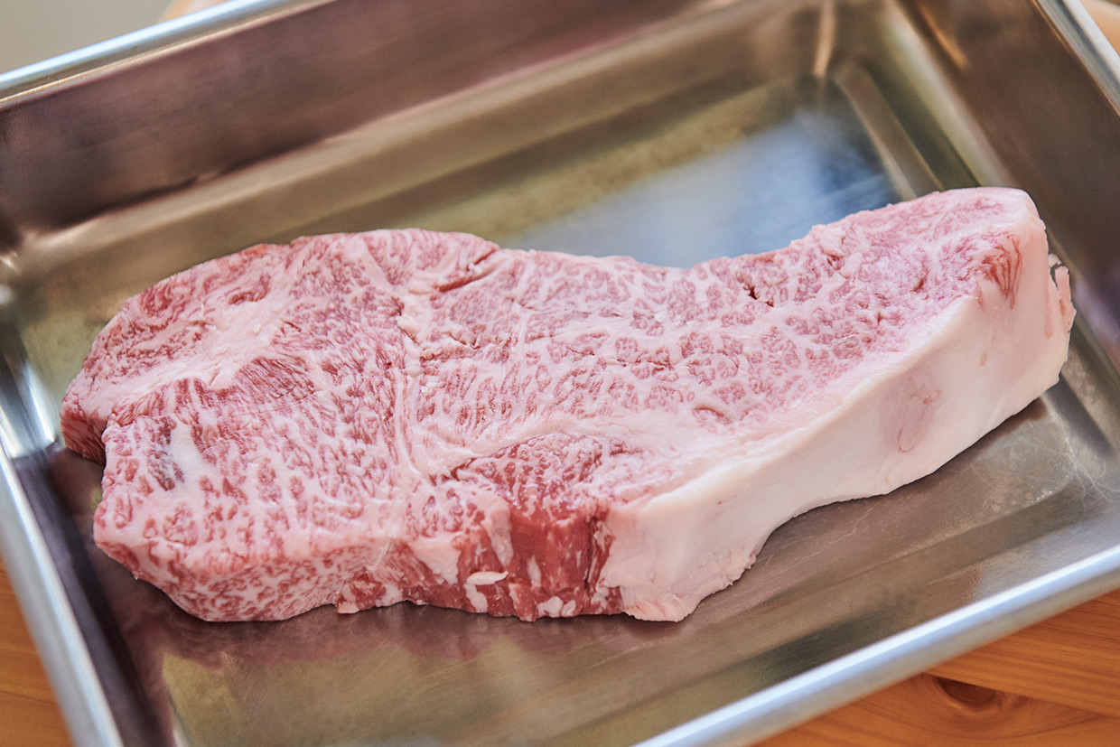 サシがきめ細かく入った若狭牛は、気候の変化に富んだ福井県で12カ月以上育まれた黒毛和種。そのサーロインを前に、シェフたちのテンションは上がるばかり。