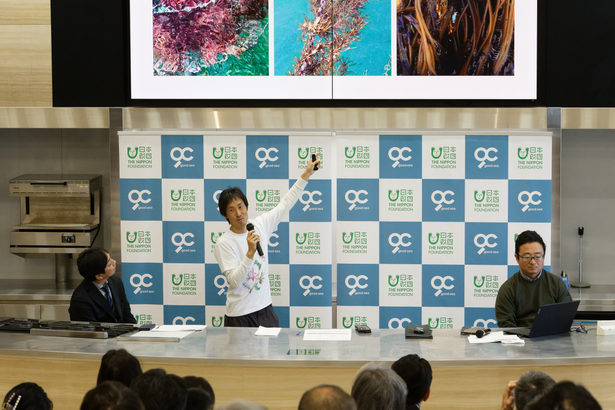 「一般社団法人グッドシー」の代表理事であり、「海藻研究所」所長でもある新井章吾さん。福井県の現役の海女である石森実和さんの3名だ。