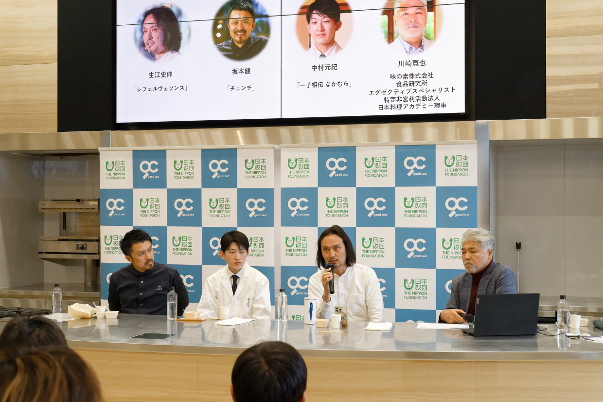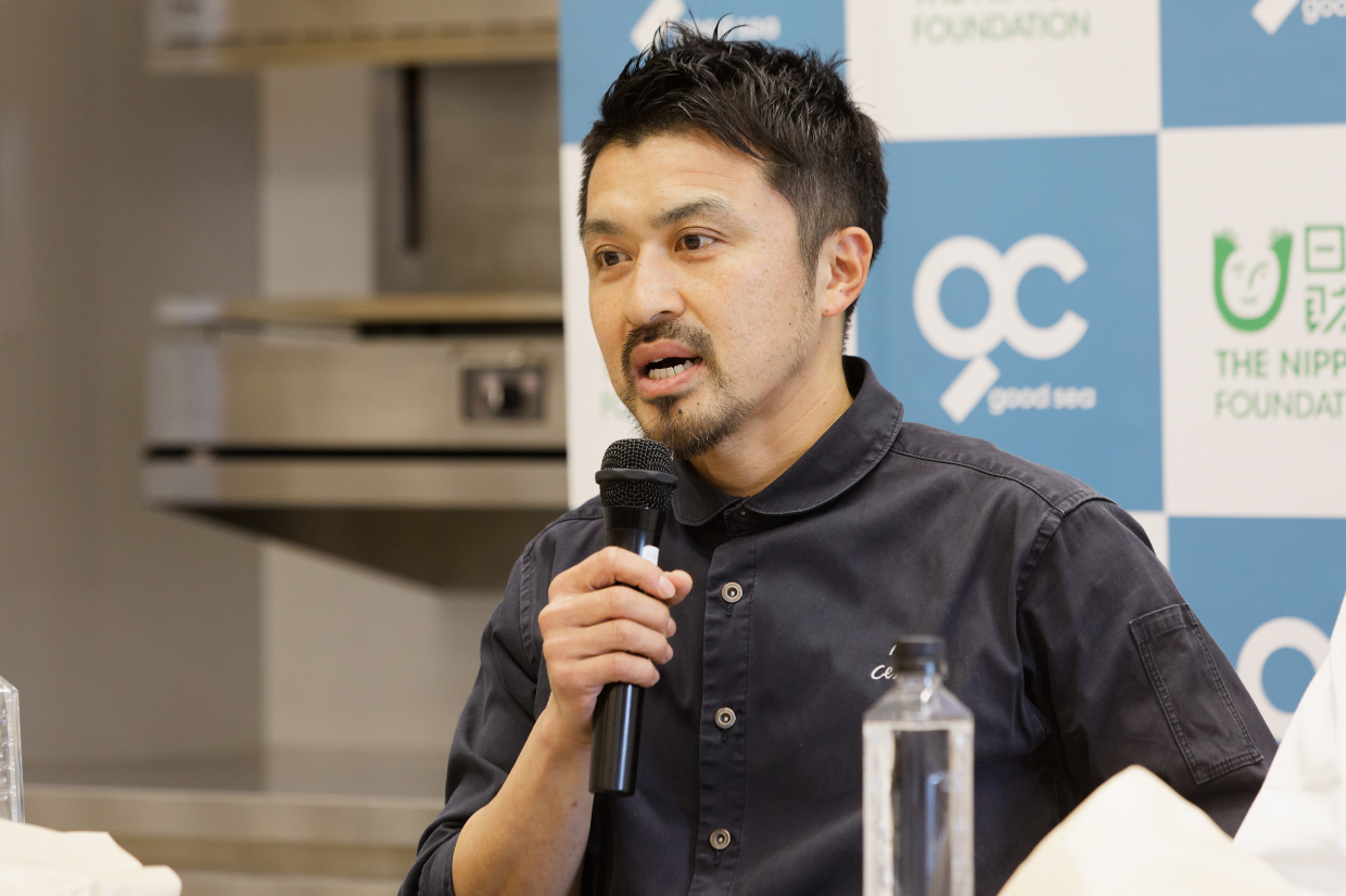 続いてのセッションは料理人の目線から。サミットに先立ち、西伊豆の海藻・海上養殖の現場を訪ね、気づいたことが話題に上る。