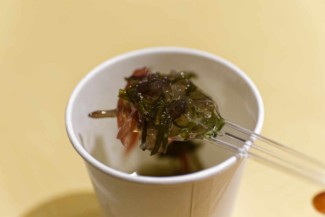 日本での海藻の消費減少を回復するのは「料理人の仕事や!」と村田さん。飲食店でも家庭でも様々な種類の海藻をおいしく調理できるレシピを提案するなどしていかねばならないと語り、『菊乃井』村田知晴さん作の海藻料理が、来場者に配膳された。海藻の生い茂る海をイメージし、スーナやひじきなどの海藻をだしで煮て、塩で味付けとろみを付けた一品だ。シャクっとした食感と磯香りが生きている。