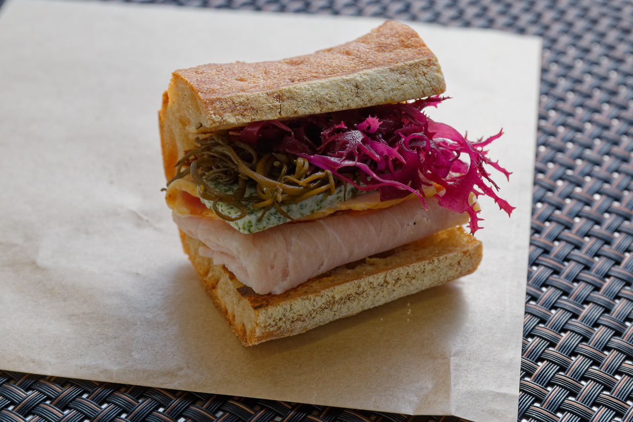 それをハムの上に重ねて、バゲットでサンド。海藻のピクルスの食感と酸味、スジ青のりの磯香り。バターが全体をまとめ食べ応えのある一品を披露した。