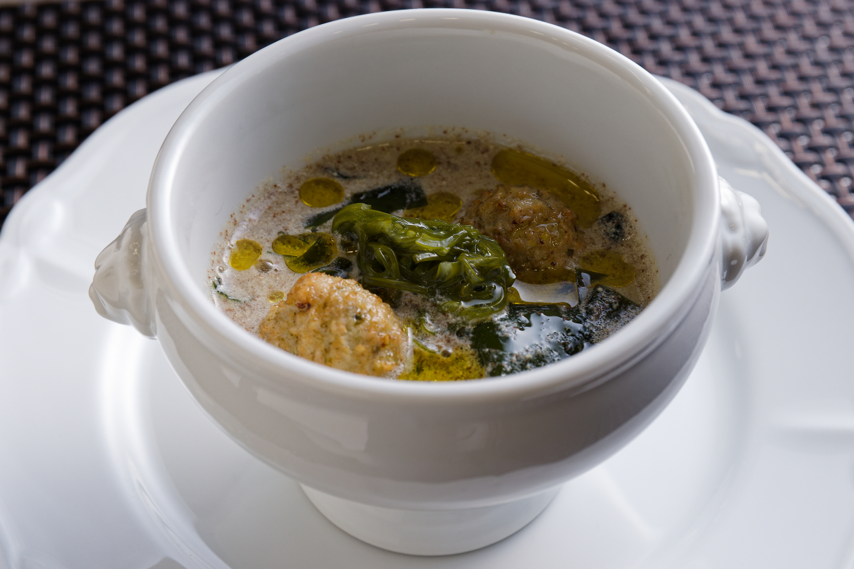 イタリア料理『チェンチ』の坂本さんは、以前、韓国人の女性シェフに教わったワカメスープを軸に考えた一品を披露した。