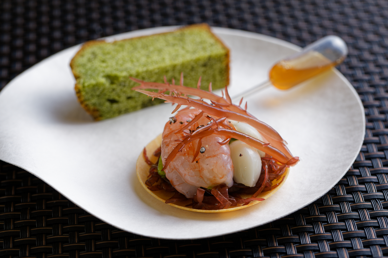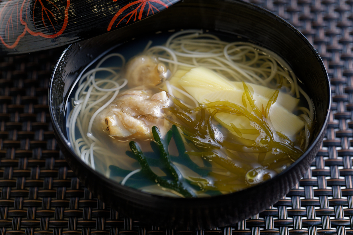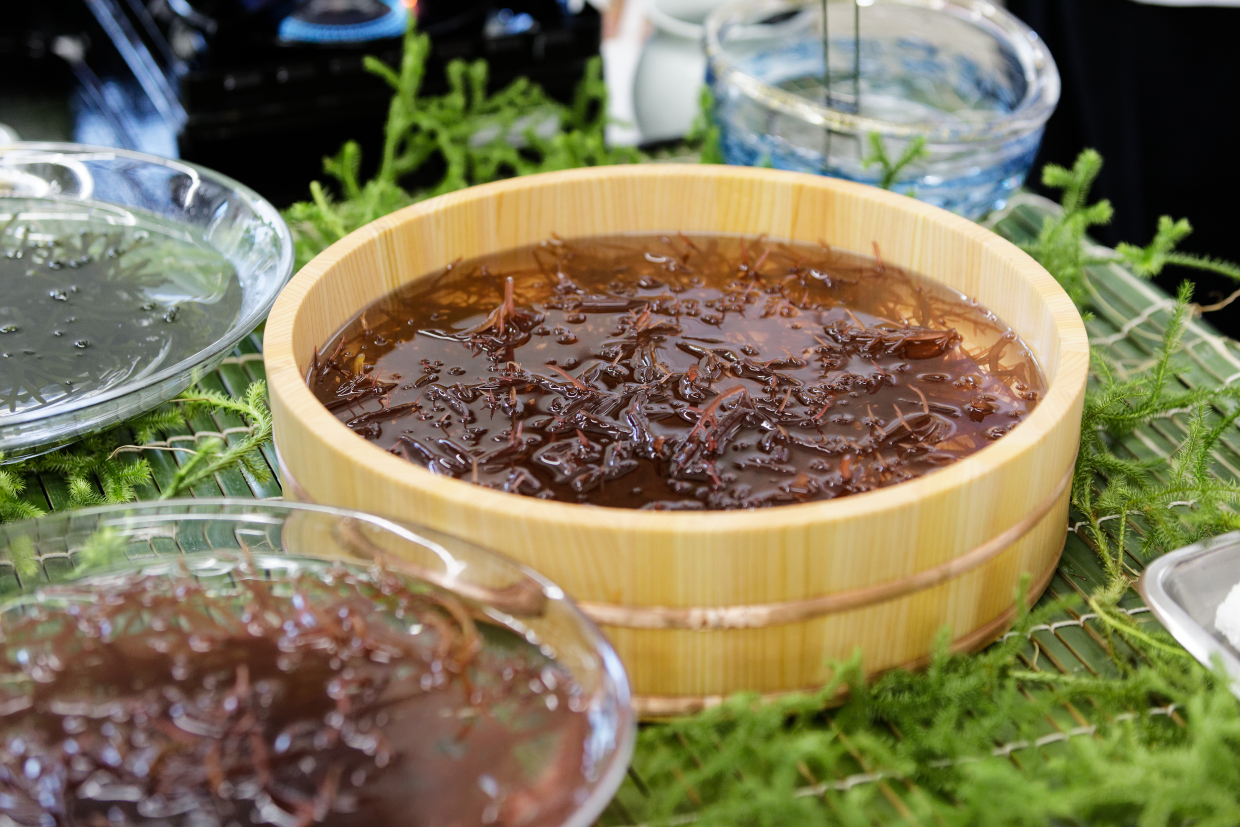 実際懇親会会場でも、提供する際に生の海藻を桶から取り出し、それぞれさっと湯通ししてからお椀の上に乗せていた。食感と香りを保ち、香りを伝えるプレゼンテーションも特別な印象を残す。