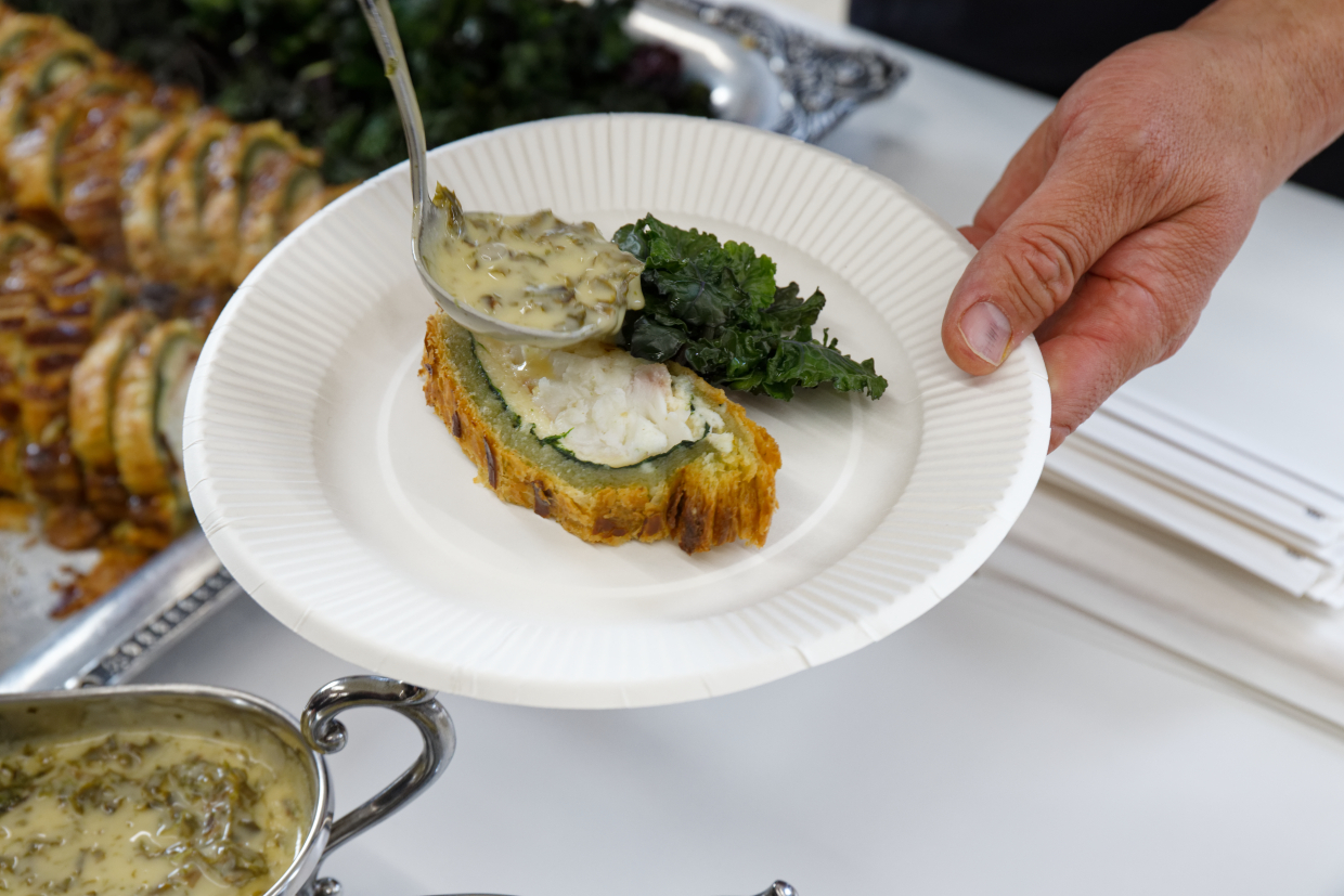 福井県の海女の石森さんを訪ねて、海藻の加工製品化の現場を見学したという『Motoi』前田元さん。海藻のいしづきを取り、手作業で天日干しにしていく手間のかかる作業に驚いたと語る。完成した幅のりはそのままおにぎりに巻いて食べるのが一番だと思うが、今回はその旨みをバターソースに閉じ込めた。乾燥筋青のりをパイ生地に使った魚のパイ包みを提供した。