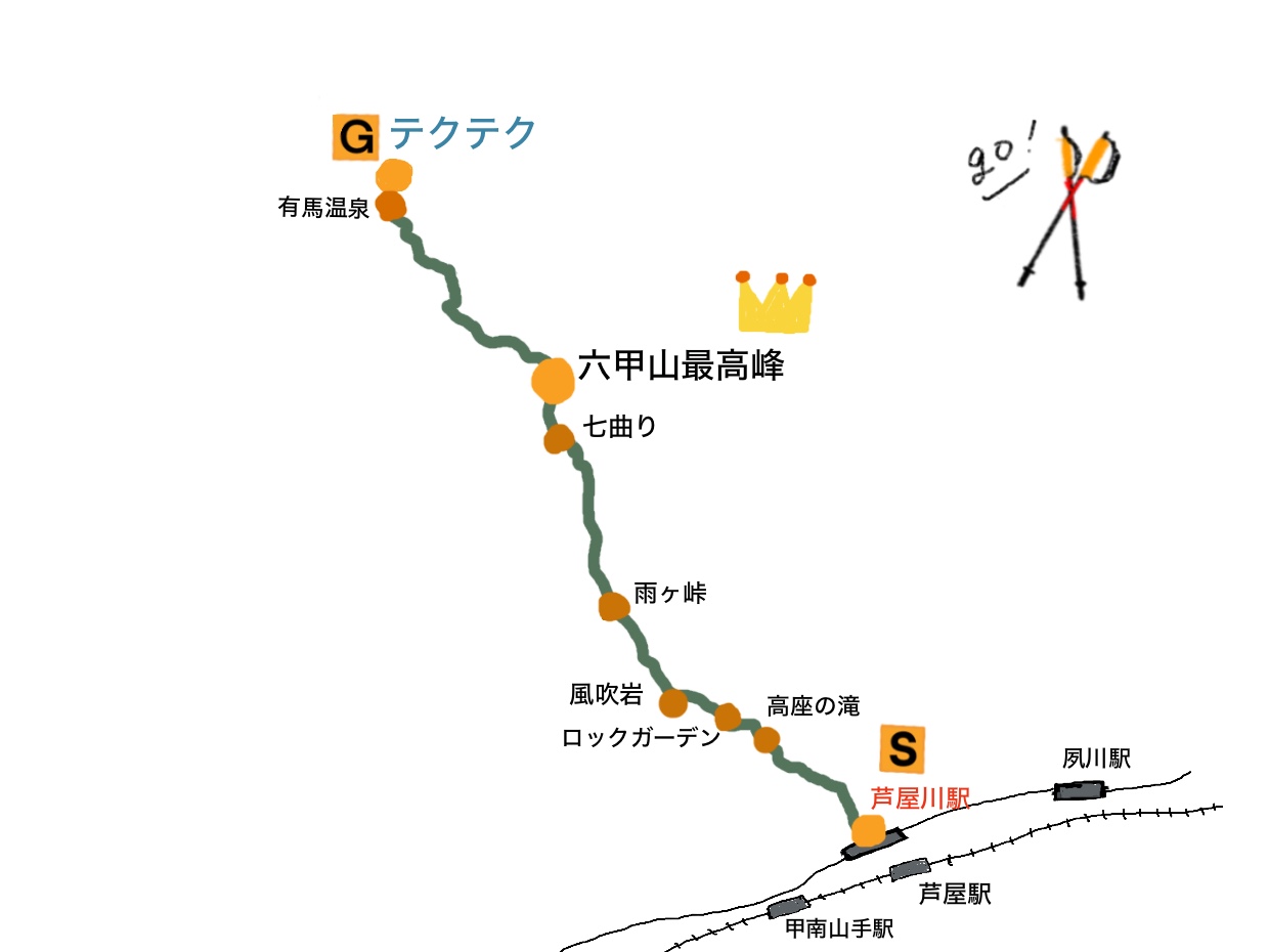 - さあ、いよいよ今回は六甲山最高峰を目指しますよ! コースは阪急芦屋川駅からロックガーデンを経由して六甲山最高峰。そして北斜面を下った先にある有馬温泉で汗を洗い流す、いわば六甲山の王道ルートです。