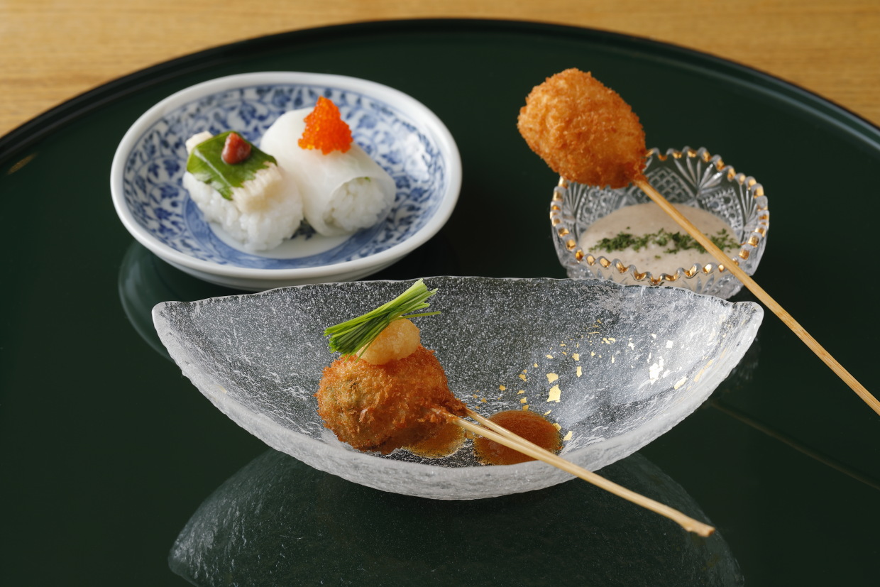 鶏のだしでコトコト、味を煮含ませた大根にパン粉を付けてラードと植物油の油で揚げる。ガラスの器に入っているのはなんとトリュフが香るクリームソース。玉ねぎに、舞茸や椎茸などのキノコをバターで炒めてしっかり旨みを引き出した上で、生クリームと合わせて煮詰め、仕上げにニンニク、トリュフ塩で調味。提供前にミキサーに掛けてふわっとカプチーノ状に。この串のためだけに仕込む手間入りのソース。せっかくなのでたっぷり纏わせて味わえば、まずパン粉の間にソースがよく絡み、コク深いキノコ風味が口いっぱいに広がった後にトリュフの香りが追いかける。これは間違いなくワイン! そしてフランス人のお客様が喜んで味わうというのも納得の味だ。一方、冬の旬魚・フグはというと、大根おろしに芽ねぎが乗った端正なビジュアル。下にだし醤油のジュレが添えてあり、こちらは日本の冬の醍醐味と感じさせる味の振り幅だ。