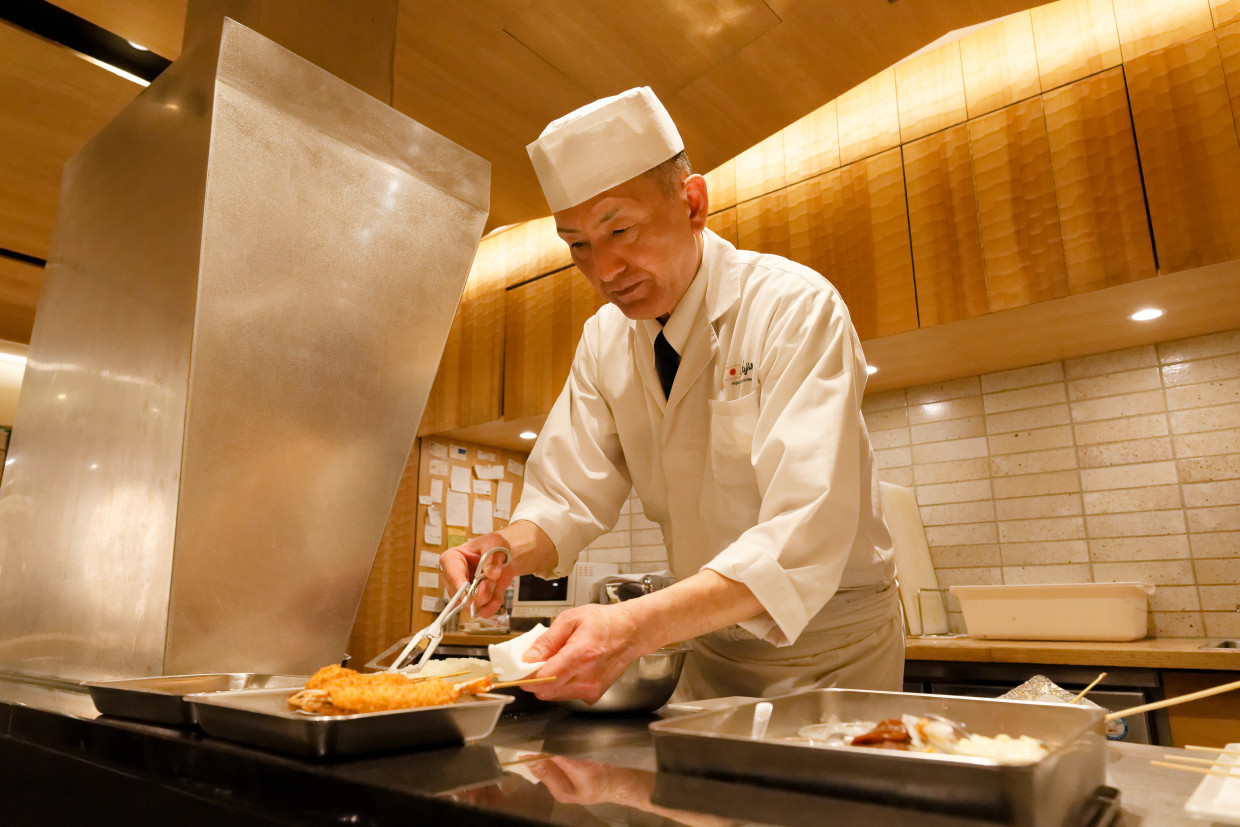 全ての献立を考え、調理をほぼ1人でこなすのは店主の金山智一さん。「大阪に来られるたびに来てくださるフランス人の方や、上のホテルにご宿泊の際に『ここで串揚げを食べるのが楽しみで』と折に触れ通ってくださる常連さんもいらしてありがたい限りです」と静かに微笑む。