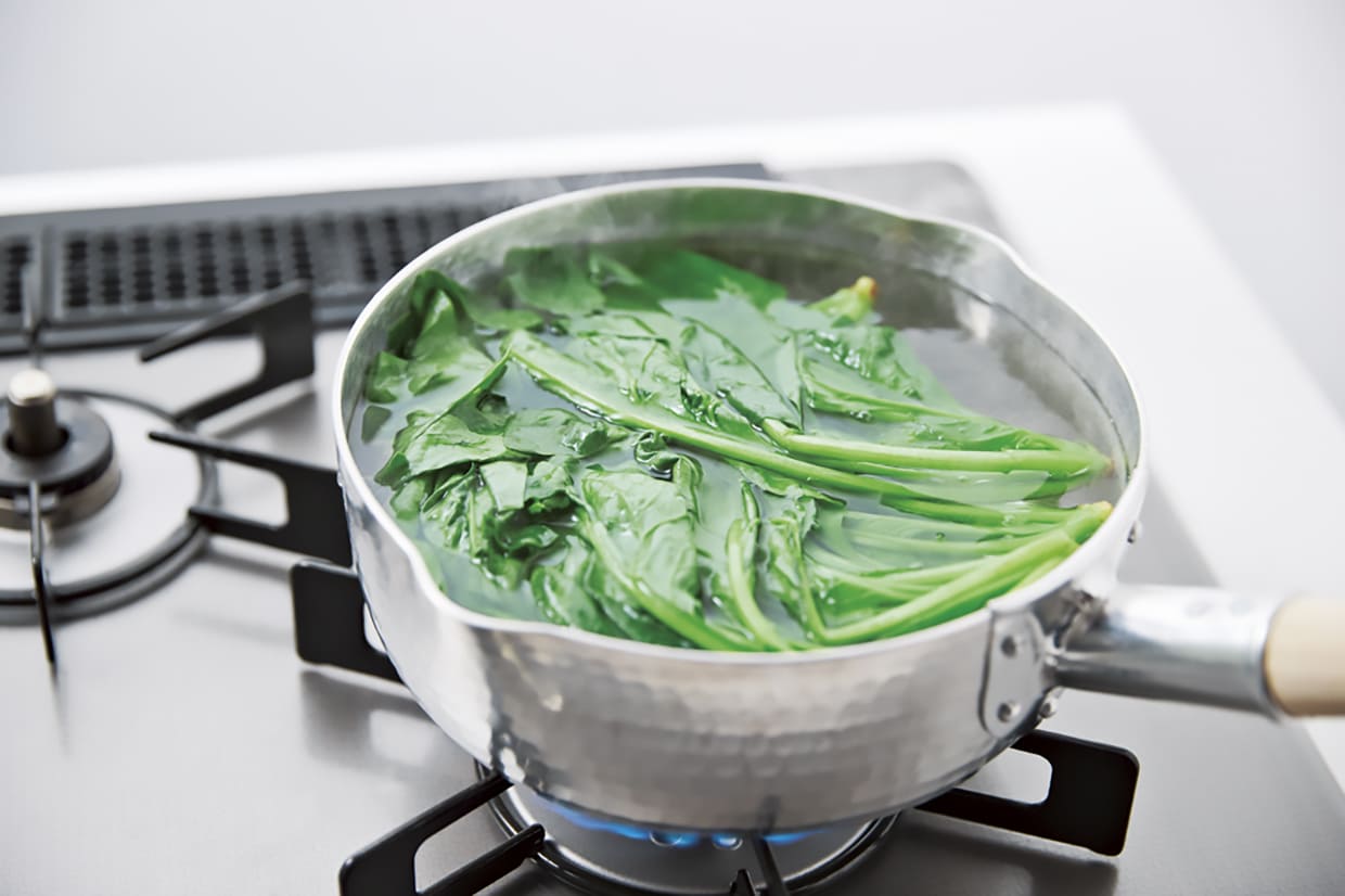 - 鍋にたっぷりの湯を沸かして塩を適量(分量外)加え、ホウレン草を根元から茹でる。冷水に落として冷ましてから軽く絞り、適当な大きさに切る。