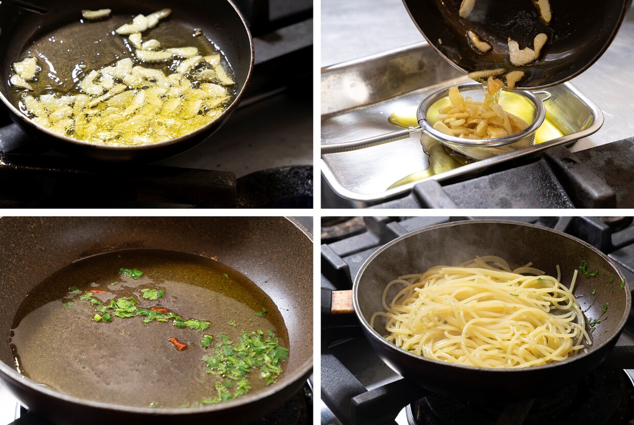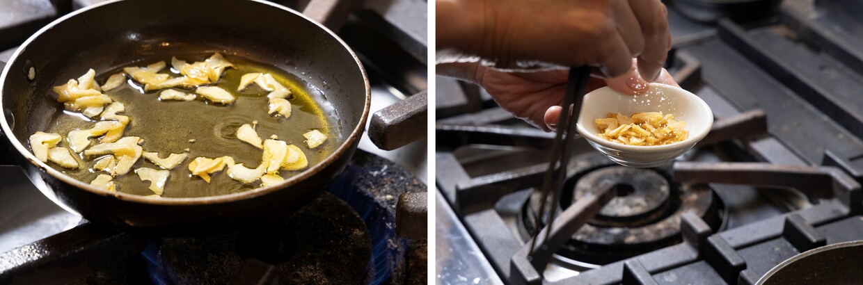 オリーブ油とニンニクを火にかけ、一部がキツネ色になったら、茶漉しで漉す作業を何度か繰り返すと失敗しない。最初は強火、フツフツしてきたら弱火に変え、フライパンを火から離したりしながら、キツネ色になるまで辛抱強く加熱すること。ニンニクはみじん切りよりもスライスの方が焦げにくく、ガーリックオイルの香りも豊かになる。ニンニクチップには塩で軽く味を付けておく。