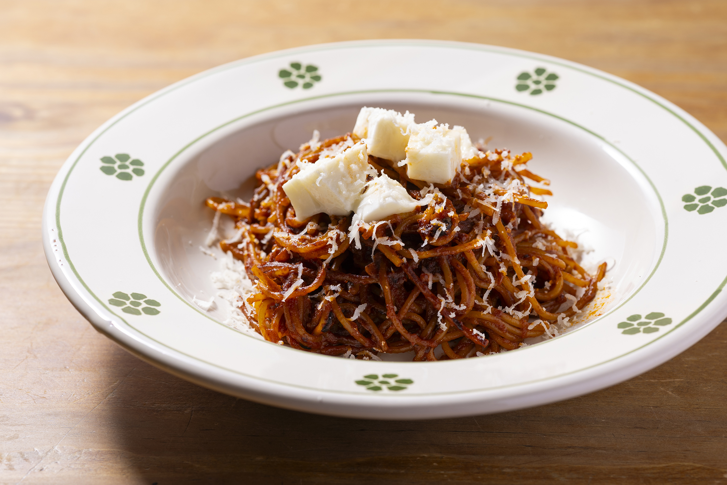 ねちっとした歯触りで、独特の噛み応えがあり、ナポリタンをピリッと辛くした印象。ハレの日の食卓に、こんな意外性のあるパスタも面白い。