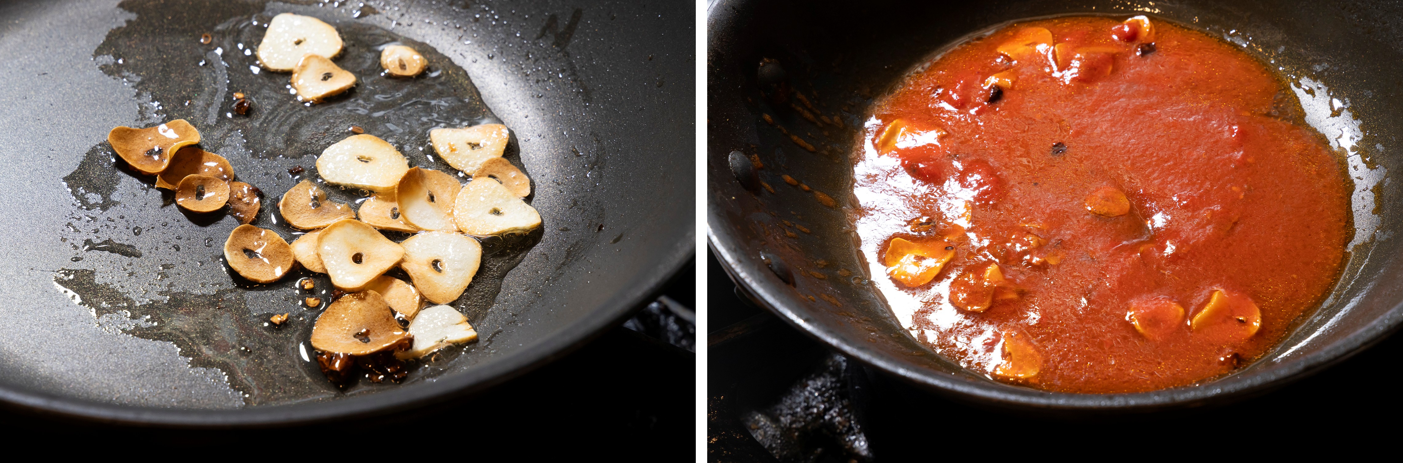 ②フライパンにオリーブ油とニンニク、タカノツメを入れ、弱火にかけて香りを出す。ニンニクがキツネ色になったら①を80ml入れ、トマトペーストを加えて煮溶かす。