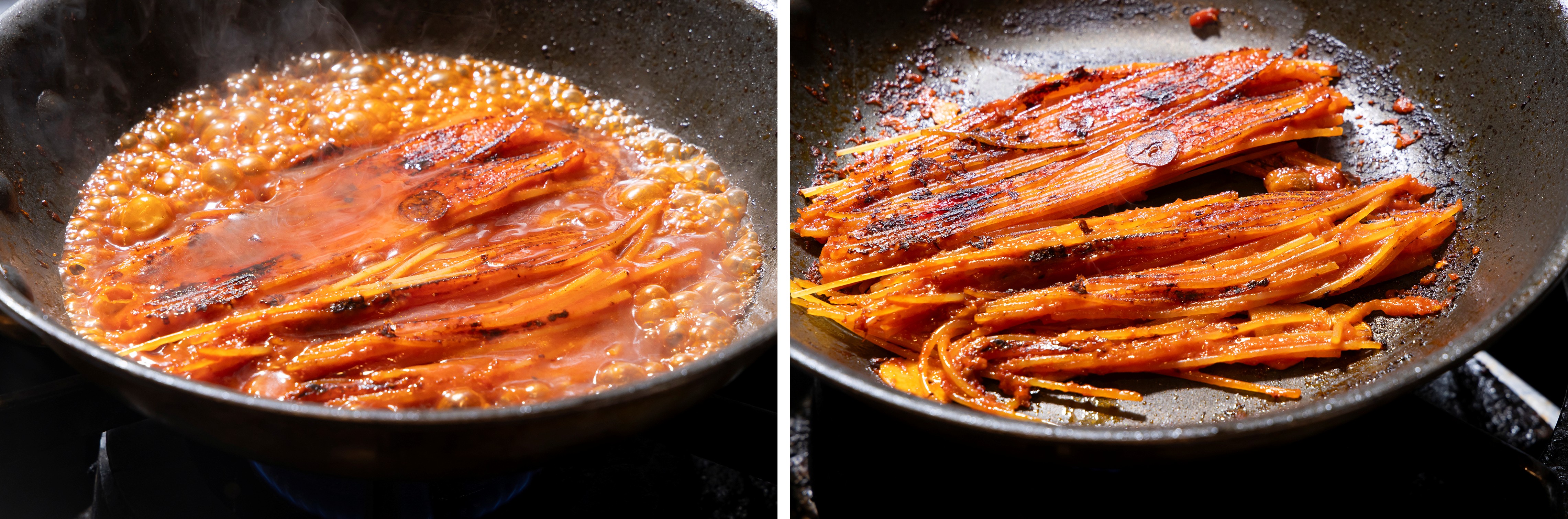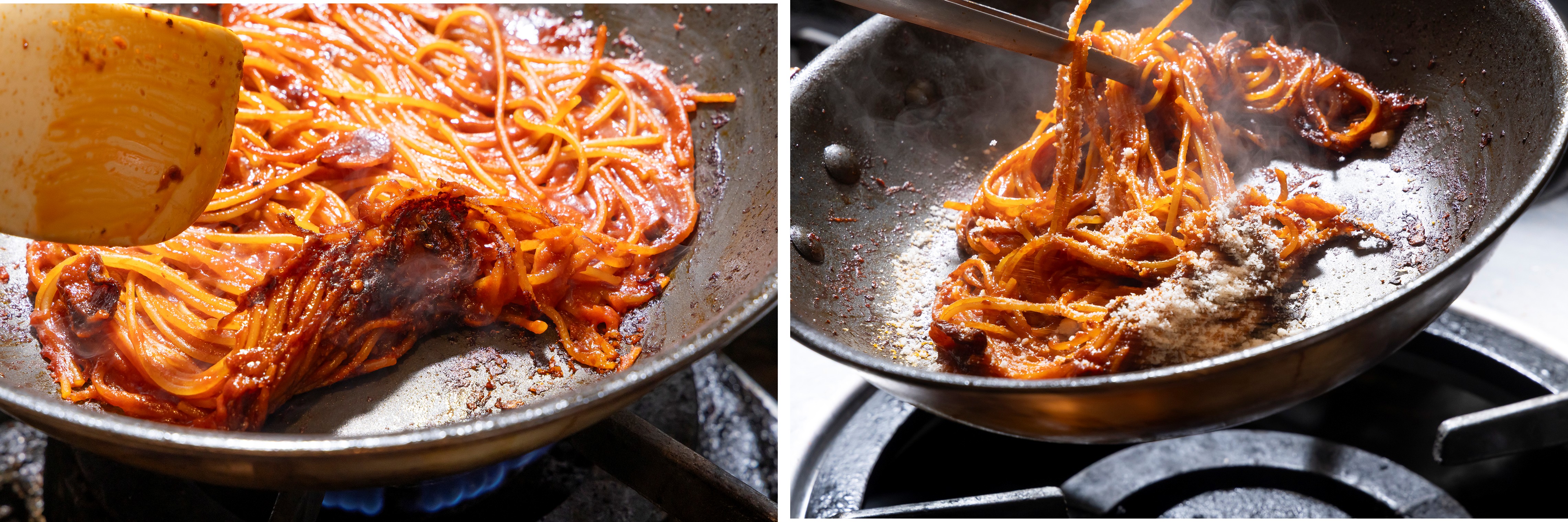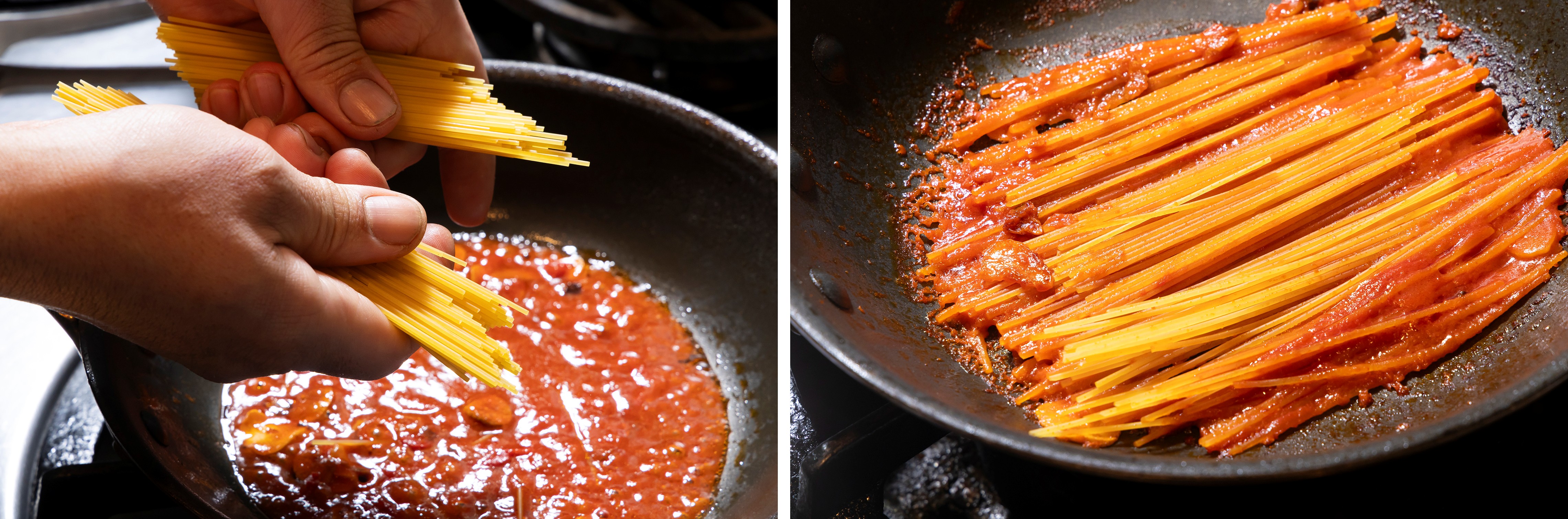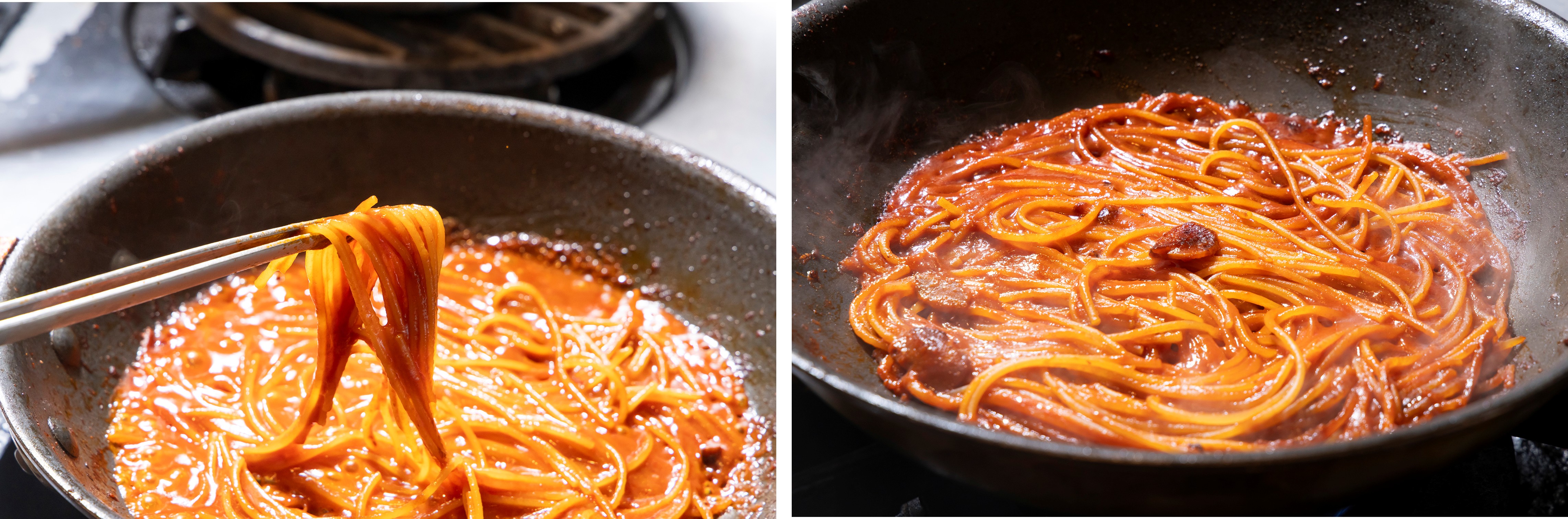 ⑤再びひっくり返して、残りの①を注ぎ入れる。スパゲッティーニがソースをしっかりと含み、持ち上げると画像左のようになったら、麺をほぐすようにして広げ、汁気がなくなるまで煮込む。
