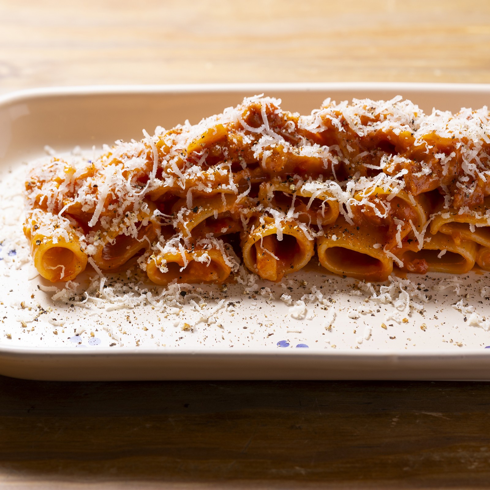 フジッリを入れたらざっと絡め、パルミジャーノとEXVオリーブ油を。「野菜中心のパスタなので、パルミジャーノでしっかりと旨みを補います。全体の塩分と相談して、量は加減してください」と八島シェフ。