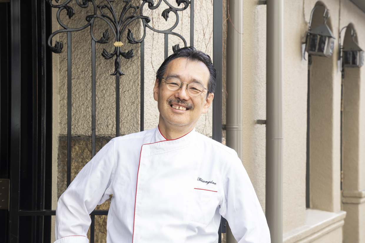 1962年、大阪府堺市出身。兵庫や東京の名店で働き、23歳で渡伊。フィレンツェ『エノテカ・ピンキオーリ』、ピエモンテ『グイド』などで腕を磨き、ワインの知識を身に付けて帰国。1989年、苦楽園に『オステリア・エノテカ・ダル・ジュンジーノ』を開き、神戸や淀屋橋などでもレストランを営む。2026年4月、西天満から北浜へ移転し、新たにカウンターに立つ。実は「トマトが嫌い」で、北イタリア料理が得意。