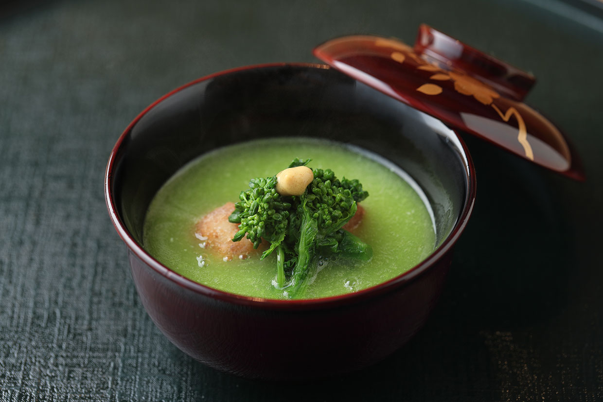 前菜に続く椀物は、季節のすり流しと決まっています。この日は、ウスイエンドウのすり流し。翡翠色のだしに浮かぶのは、加賀レンコンと海老の団子です。