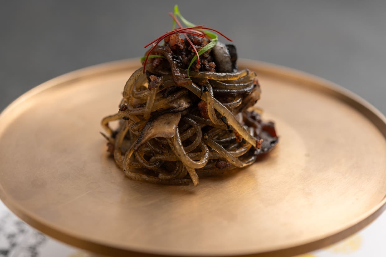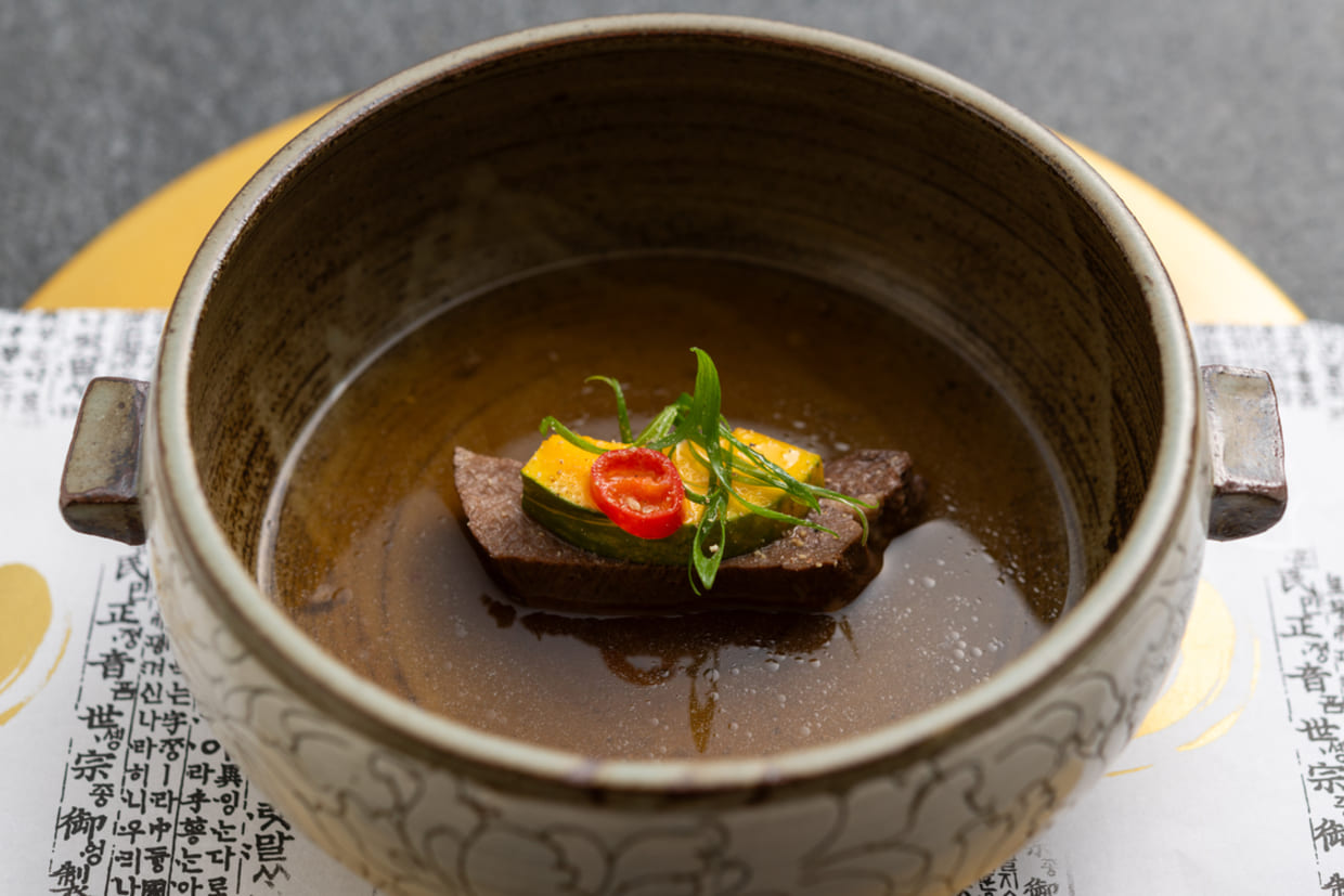 宮廷料理の古式にのっとり、モダンコリアンコース18000円(10品前後)の一番手を飾るのはアワビの肝をたっぷり使ったお粥。最初に食べることで、以降につづく料理の香辛料の刺激から胃を守ってくれるそう。こんなところからも、伝統の知恵を感じさせてくれます。