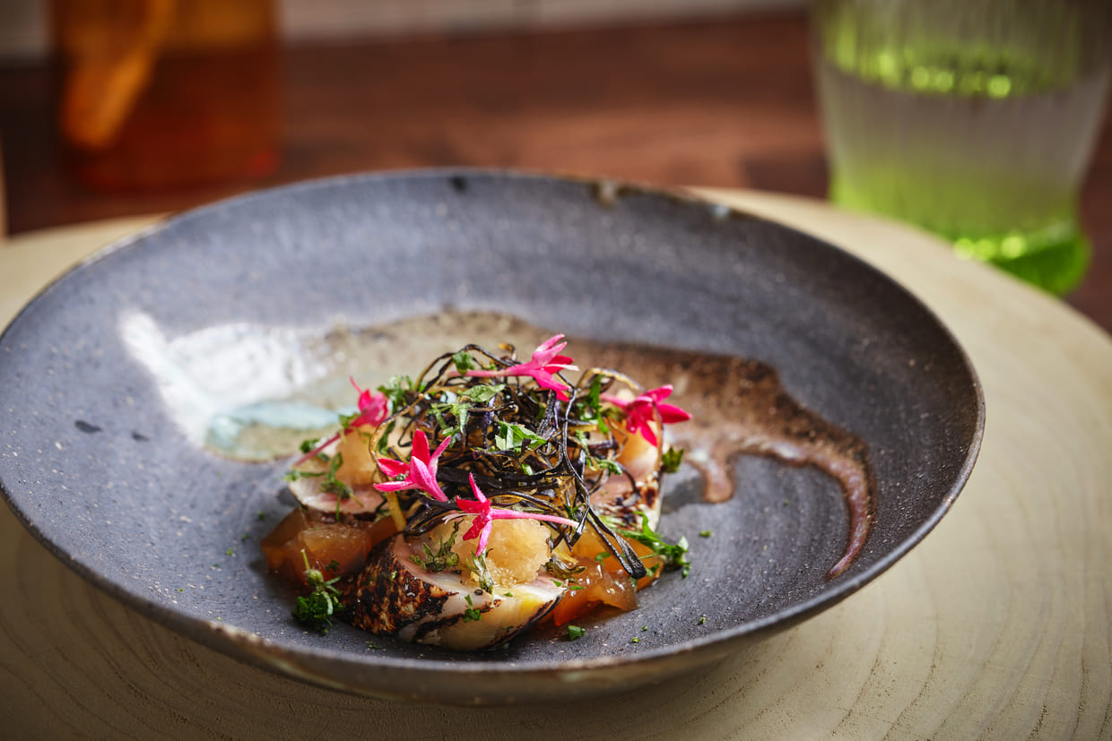 和の香りがする前菜は、開いたサンマをシトロンヴィネガーで軽くマリネし、中に新ショウガの甘酢漬けを巻き込み、皮目は香ばしく炙ってあります。オーブンで焼いた秋茄子に、大根おろし、一番だしと醤油、イタリアンヴィネガーを合わせたジュレも添えて。上にナスの皮の素揚げをあしらって食感にアクセントを。全体的に日本の秋を思い起こさせる味わい、だけどイタリア料理の技法も融合したひと皿です。