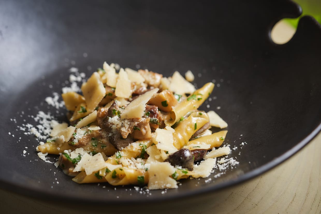 全国各地の生産者を直接訪ねて、独自のルートを開拓してきた岡尾さん。「秋になったら信州のキノコ取りの名人のおじいさんが、採れたものを送ってくれるんです」と目を輝かせます。この日は「ヤマドリ」「ナラタケ」「ハナイグチ」など名人による希少なキノコがたっぷりと厨房に届いていました。その国産キノコの旨みと香りをショートパスタのガルガネッリに絡ませて。香りと食感が抜群です。