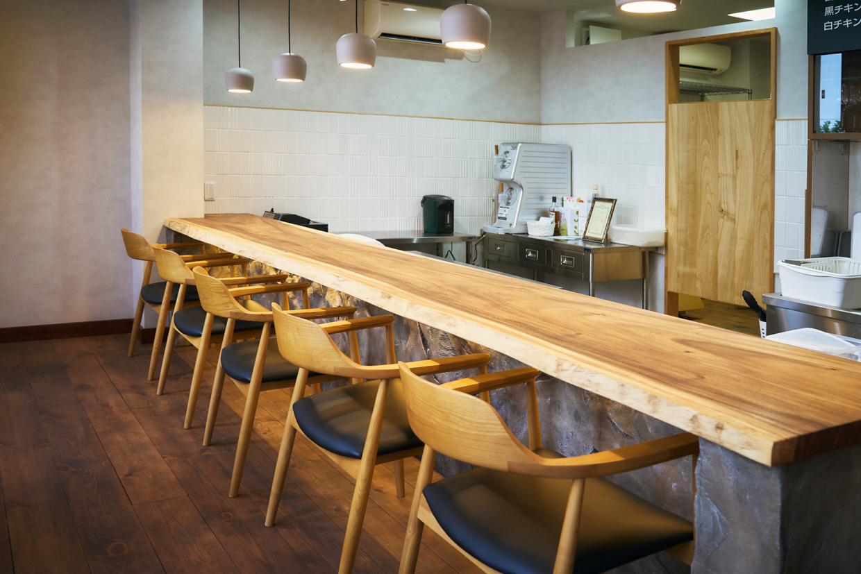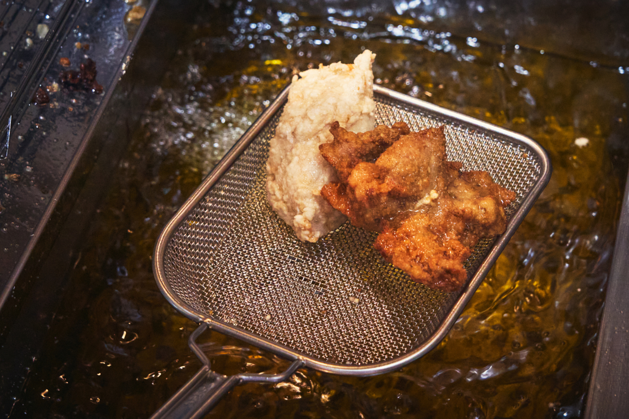 フライドチキンには2つのテイストがある。ムネ肉を使う「白」とモモ肉の「黒」。まず何より食材が大切ということで、但馬産か淡路島産の朝挽き鶏で、一度も冷凍されていない新鮮な鶏肉を使う。「白」は塩味がベース。「黒」は醤油とオリジナルスパイスに漬け込んで下味を付けてある。注文が入ってからそれぞれ企業秘密の異なる衣を纏わせて100%ピュアオリーブオイルで揚げていく。小麦粉、卵、化学調味料は不使用のグルテンフリーというのも特徴だ。