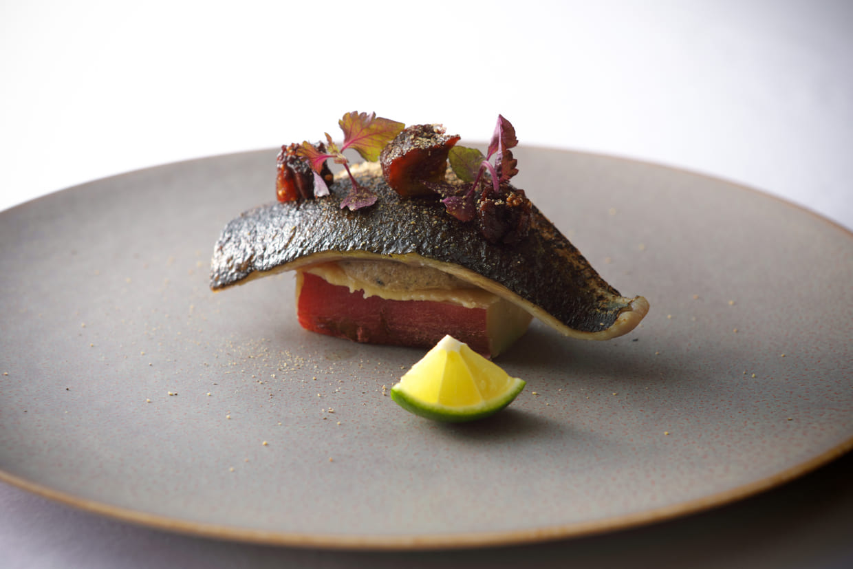 脂がのって身厚なサンマのグリルと、内臓部分はタマネギとタイムやオリーブを合わせてリエットに。土台には蒸したサツマイモに西京味噌を塗って、間のリエットとつなぐ。トップにはイチジクの赤ワイン煮と赤しその新芽と黒コショウをあしらって。日本の秋の風物詩、サンマの塩焼きを思い起こさせつつも、決して和食ではない着地点。そのプレゼンテーションの絶妙さが印象的だ。
