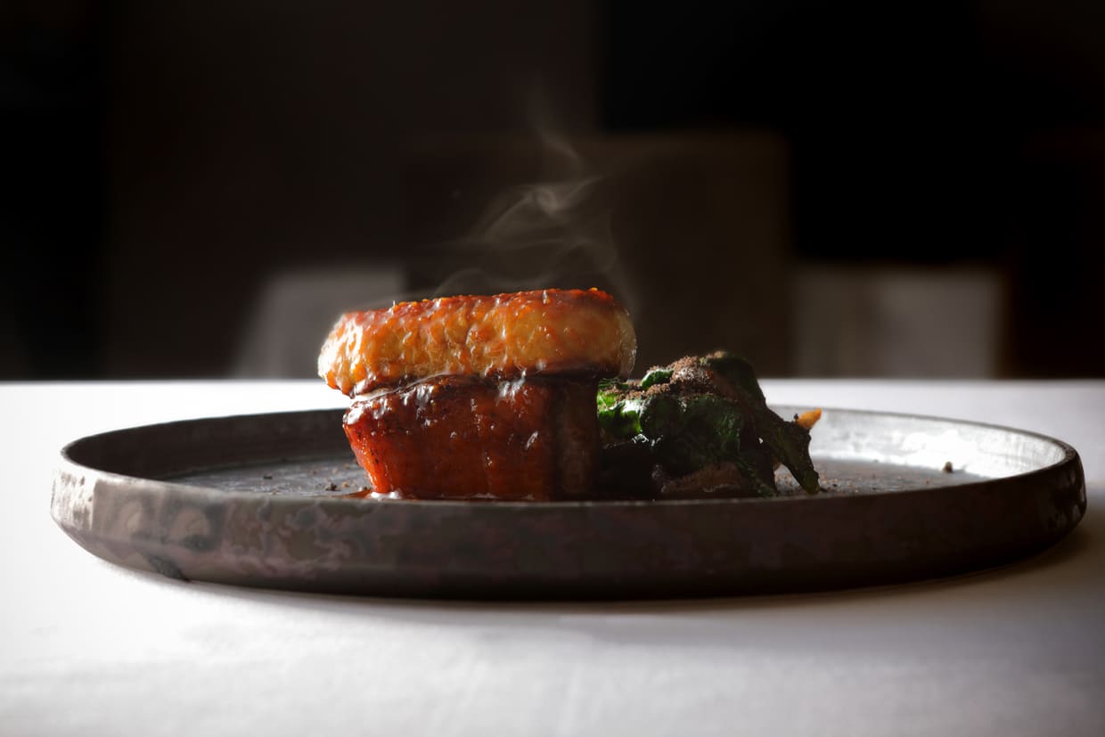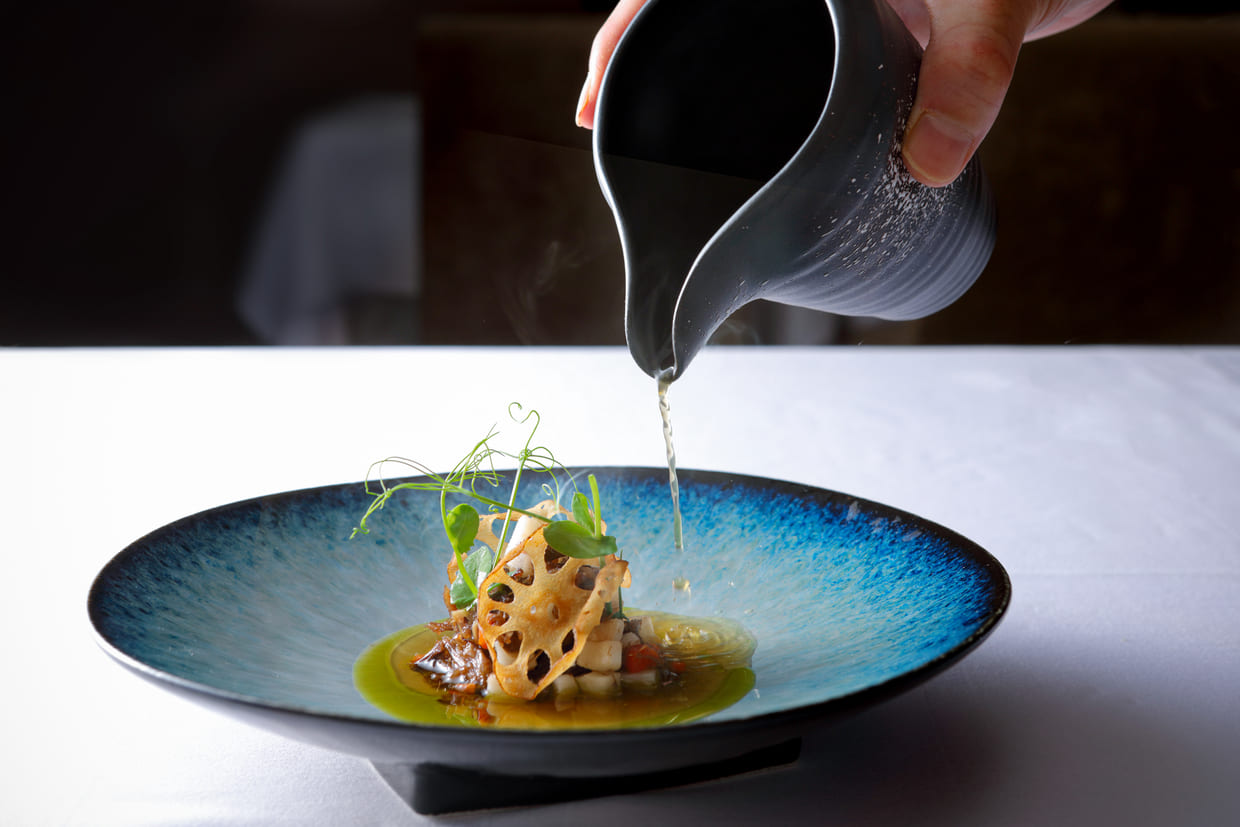 マネージャーの磯口 武さんがテーブルで注いでくれたのは熱々の牛テールスープ。じっくり時間を掛けて煮詰めた、けれどもすっきりと雑味なく透き通ったスープの香りに食欲をそそられる。ひと口含めばその滋味深さにうっとり、目を瞑る。器の中には、レンコン、オリーブ、パプリカ、スープを取ったテールのほぐし身も炒め合わせて潜んでいる。