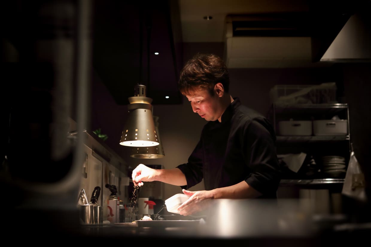 シェフの梅谷宜伸さんは、大阪を代表するグランメゾン、中之島の『レストラン ヴァリエ』で長年2番手を任された人物だ。正統派のフランス料理の技術を身に付けて独立を果たした実力派。流れるように供されるコースの1皿ごとにハッと心を掴まれる。どの料理も存分に引き出された香りや旨みによって季節の輪郭がはっきりと描かれている。