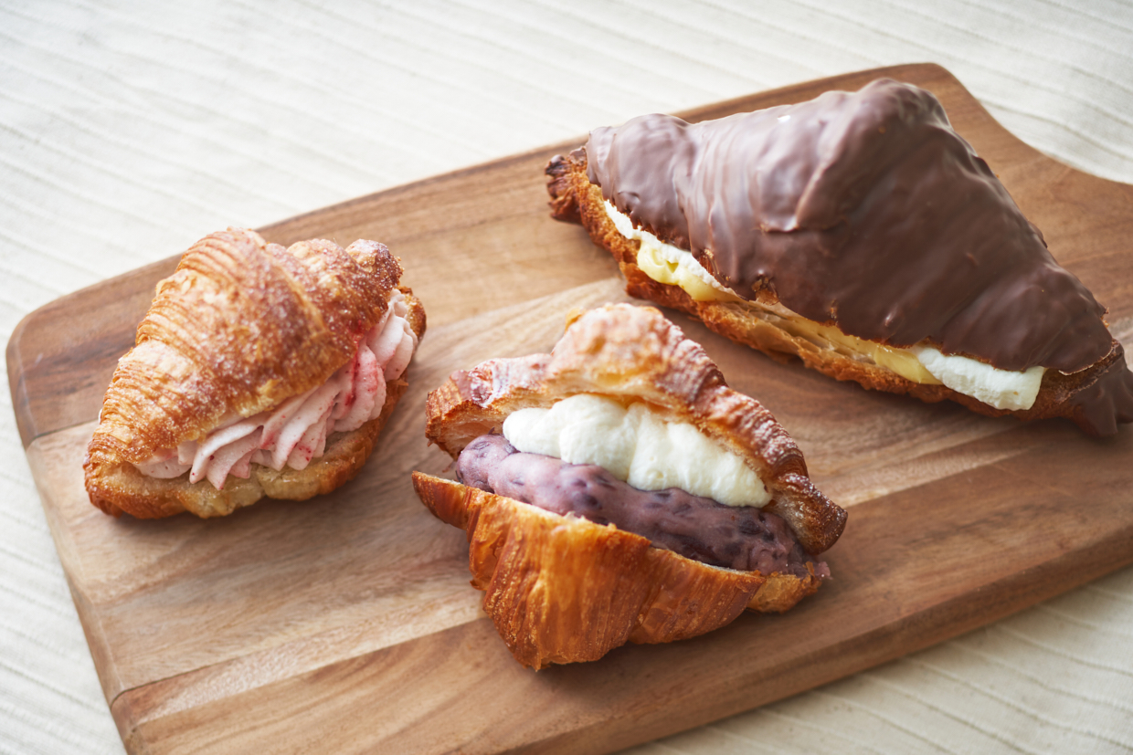 表面はパリパリのチョコレート「クロワッサンショコラ エクレア風」は、中にカスタードとホイップクリームを抱き込んだ洋風仕立て。一方全く違う表情を見せるのが「あんこバター詰めクロワッサン」だ。こちらは生クリームと、あんことバターの程よい塩味が不思議なほどに融合し、手が止まらないおいしさ。緑茶とも合いそうなクロワッサンとなっている。