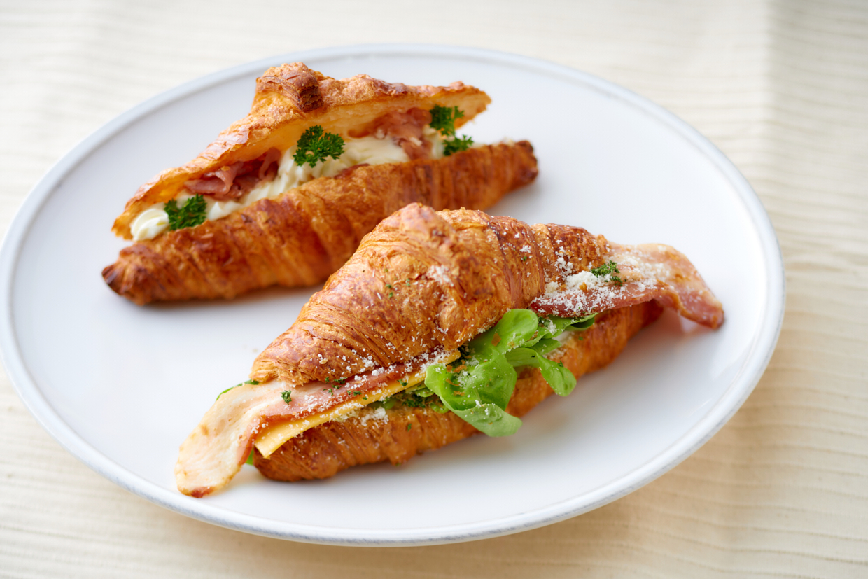 取材時なら「ベーコンとチェダーチーズと無農薬リーフのクロワッサンサンド」。焼いたベーコンとチーズの濃厚さと、和歌山県高野山で水耕栽培されている無農薬リーフのフレッシュさ。