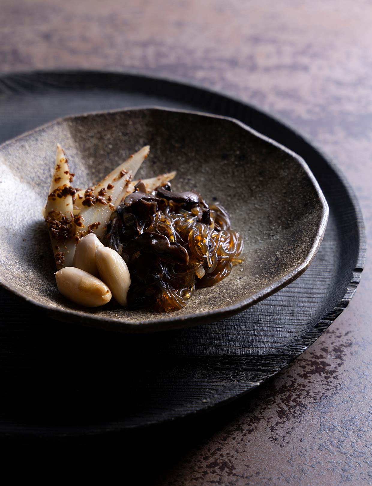 私はフレンチを学んでから和食を始めたので、どんな食材のお椀でも一番だしで仕上げるのが不思議やったんです。フレンチやったら、鴨の料理には鴨のソースを合わせますから。実は親父も同じような疑問を持っていて、すでにいろんな魚介だしを活用していました。そこにコンソメの技法を組み合わせた、いわば親子共作の煮物椀です。