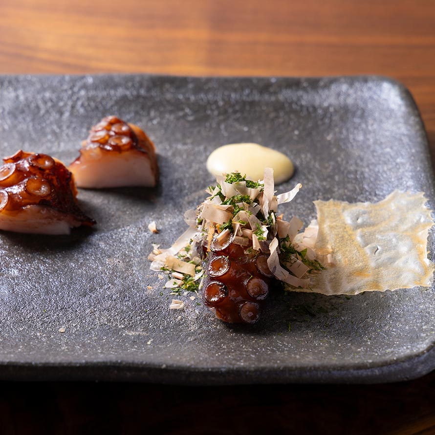 晩秋からは近海マグロがおいしくなりますよね。エサになる鯖は、イワシやコハダなどの小魚を食べて身を肥やします。11月は海水の温度が一気に下がって、青背の魚が脂を蓄える時季。その海の生態系を一皿で表現しました。昨今、海の環境保全が問題になっていますが、どんな小さな魚でもいなくなれば生態系は崩れます。そうした問題を、小さな魚から順に食べていただくことで、さりげなく伝えられたら。といっても、難しく考えなくていいんです。4種の青魚の食べ比べを楽しみながら、少しだけ海のことに想いを馳せていただけたら充分です。