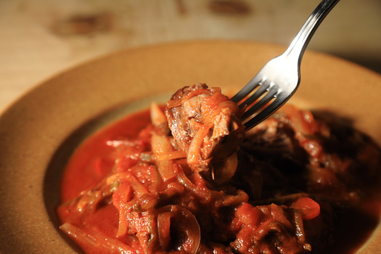 ナイフもいらないくらいホロトロに煮込まれた仔羊から染み出た肉汁が、玉ねぎの甘みとトマトの酸味と合わさって、極上のソースとなっている。立ち上る湯気からの香りを嗅ぐだけで、喉の奥が赤ワインを欲する。