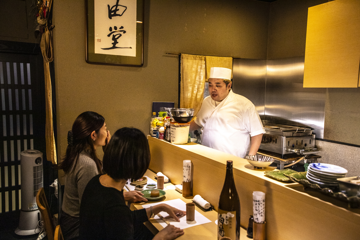 ガラリと引き戸を開けると、雰囲気は一変。緊張が解け、ふわぁっとだしの香りと温かい空気、ご主人・日野由堂さんの「いらっしゃいませ」という元気な声が迎えてくれる。