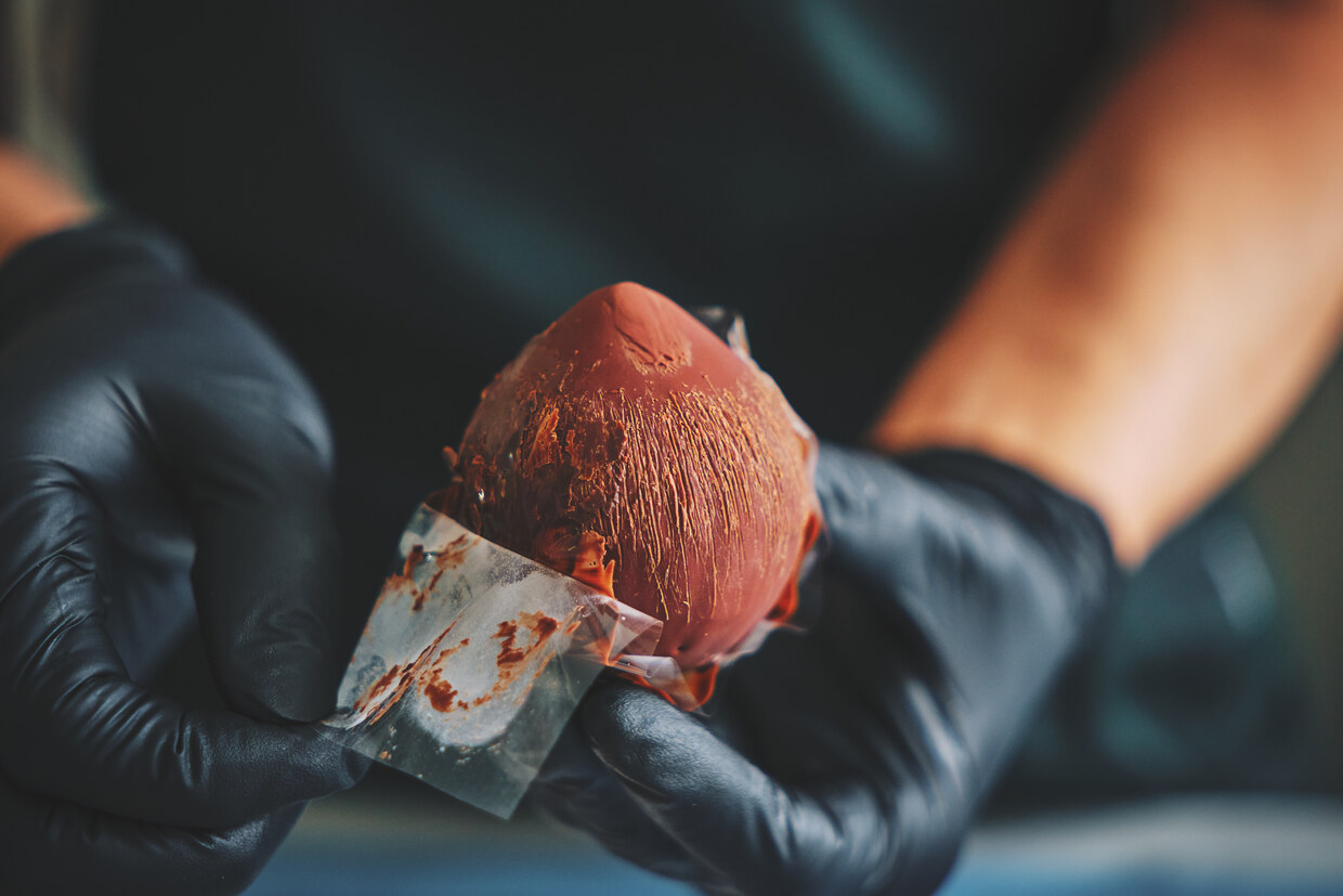 スイートチョコレートとカカオバターで皮付きの栗を表現しているのが「宝珠(ほうじゅ)」。その名からもわかる通り、観音像や菩薩像の掌に乗せられている先端が尖った珠をモチーフにしている。チョコレートでコーティングした表面に小さなブラシを当ててガシガシこすることで栗の佇まいを表現。既成概念にとらわれない、自由な境地が奥山さんの武器だ。