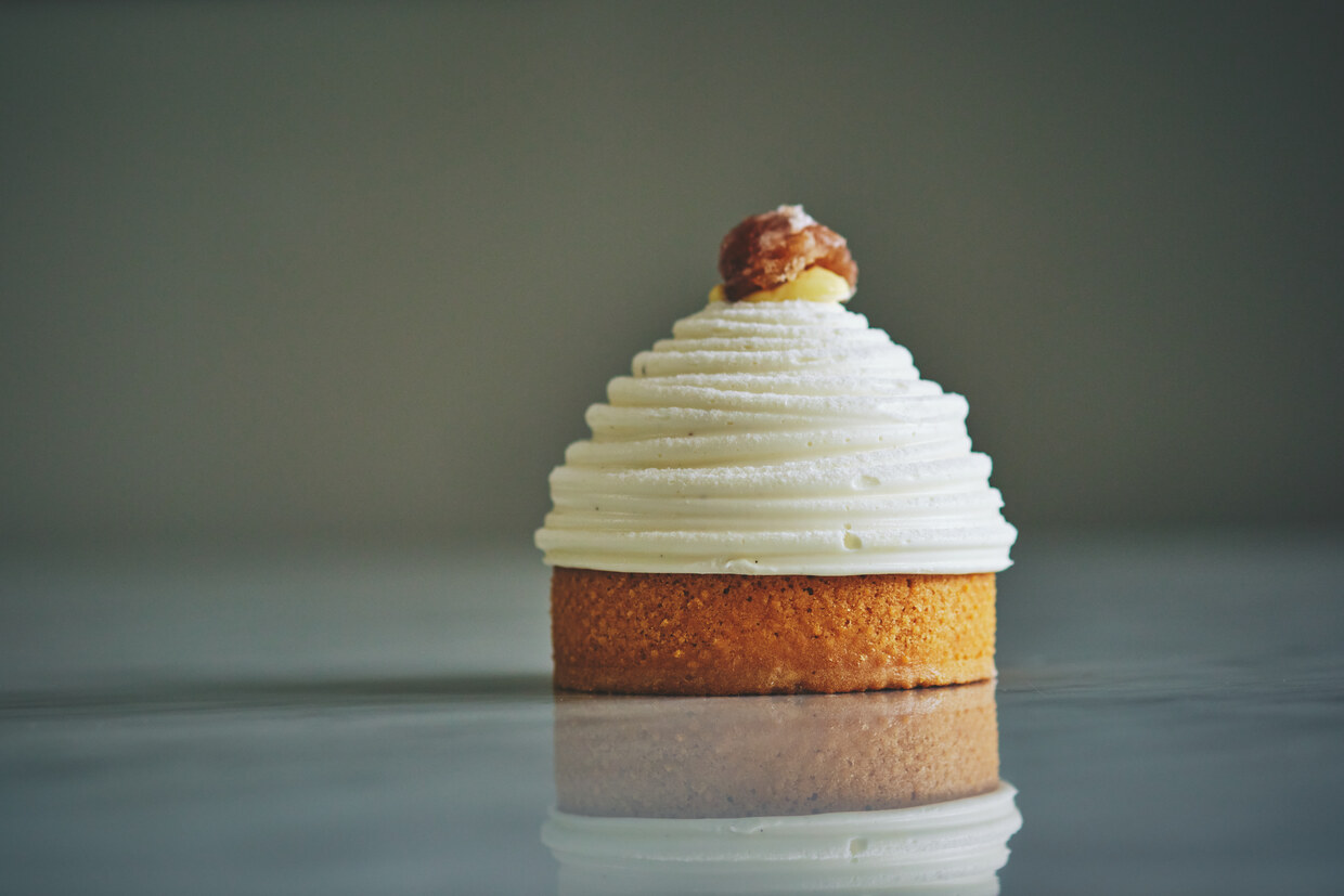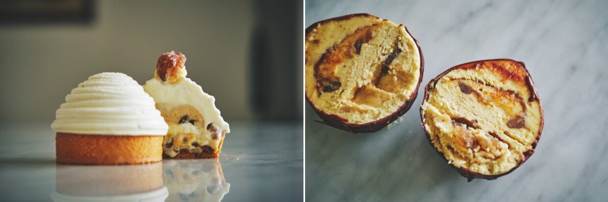 「雪塊(せっかい)」と名付けられたもうひとつの栗菓子はイタリア産の栗が主役。タルト生地の器に、砕いたイタリア産マロングラッセ入りのブリュレを乗せ、カラメルソースを流した上から宝珠と同じマロンクリームをたっぷり。表面には、ヴァニラ風味のホワイトチョコガナッシュを絞り出し、モンブラン(白い山)に。こちらもどこを食べても栗の風味が楽しめる仕掛けになっている。